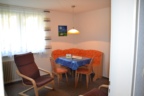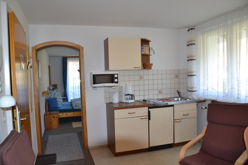 App. Nr. 4 - 3 SterneMöbliertes Appartement mit Balkon für 2 Personen (Beistellbett möglich). 1 Schlafraum mit Du/WC, Bettwäsche und Handtücher sind vorhanden. 1 Wohnraum mit komplett eingerichteter Küchenzeile und Essecke, Kaffeemaschine, Radio, Telefon und TV.